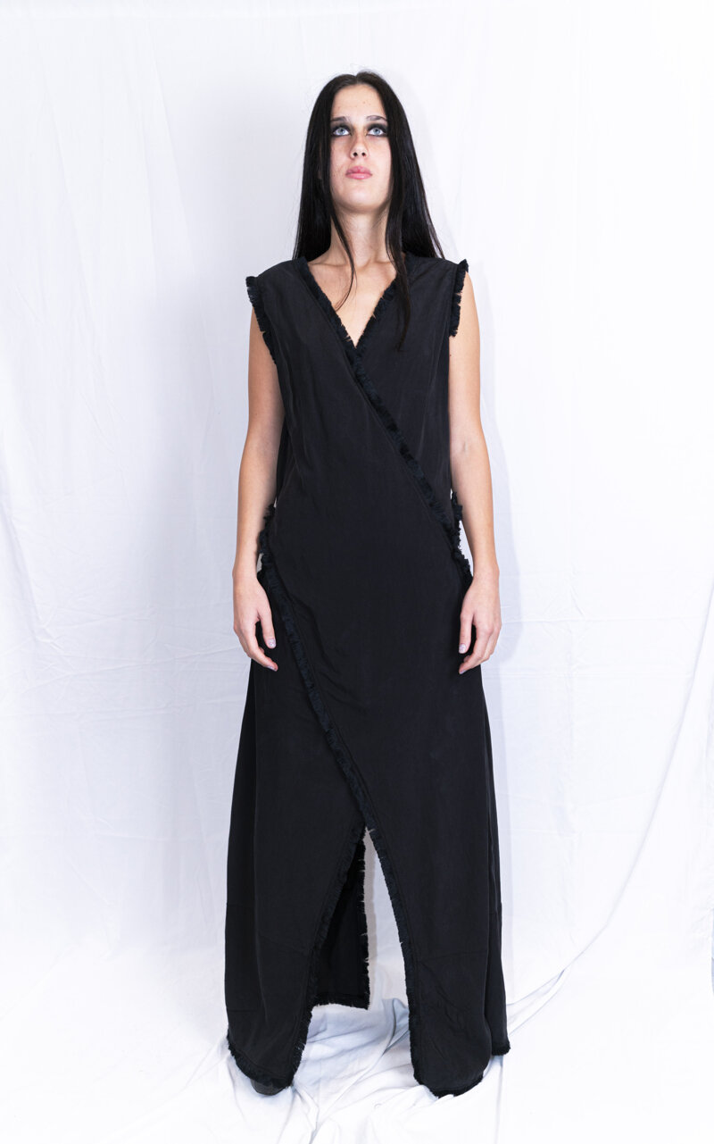 Abito lungo scollato sul davanti e sul dietro. Applicazione di frangie lungo il perimetro. Colore: Nero.
