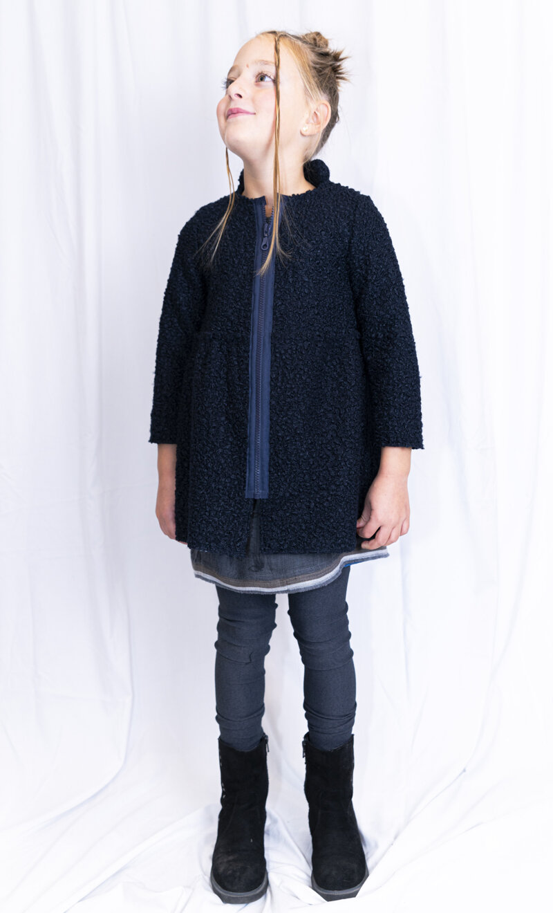 Cappottino con maniche a tre quarti, girocollo e zip sul centro davanti. In orsetto misto lana. Colore: Blu Notte