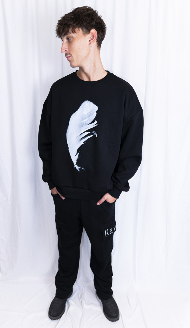 Felpa girocollo oversize in cotone garzato con stampa bianco su nero fronte e retro